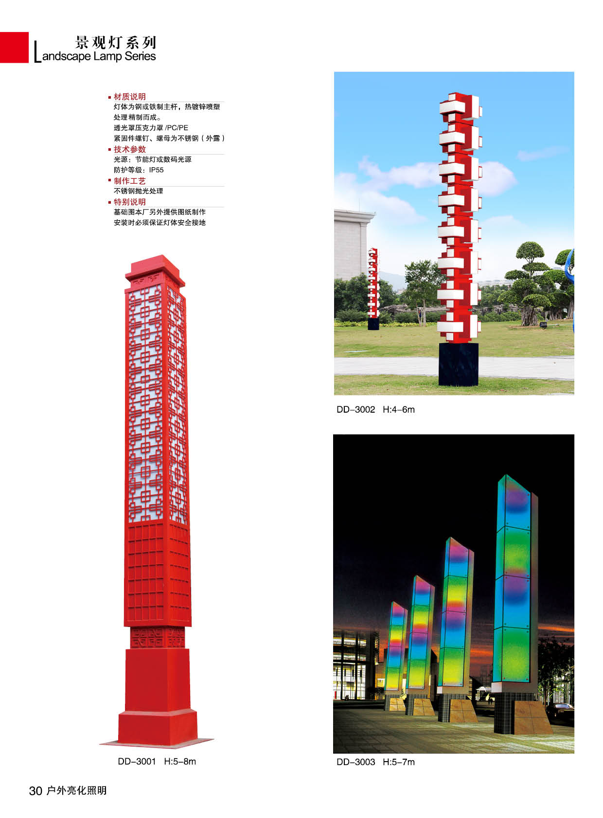 景觀燈是現(xiàn)代景觀中不可缺少的部分,它不僅自身具有較高的觀賞性,還強調(diào)藝術燈的景觀與景區(qū)歷史文化、周圍環(huán)境的協(xié)調(diào)統(tǒng)一;景觀燈利用不同的造型、相異的光色與亮度來造景;例如紅色光的燈籠造型景觀燈為廣場帶來一片喜慶氣氛,綠色椰樹燈在池邊立出一派熱帶風情;景觀燈適用于廣場、居住區(qū)、公共綠地等景觀場所。